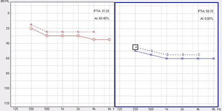 <span style="font-size:16px;"> 純音聽閾測試是聽力學所有測試項目中最基本的一項內容,包括氣導(AC)、骨導(BC)、最舒適閾(MCL)與不舒適閾(UCL)測試。測試結果能夠直接反映患者雙耳的聽力損失程度、性質與動態范圍,還能夠間接反映患者的患病位置、病因與助聽后效果。</span></p><p><span style="font-size:16px;"> 一般地,整個檢查控制在10分鐘左右,既能全面做完檢查,又不至患者疲憊而影響主觀反應。</span></p><p><span style="font-size:16px;"> 純音聽閾測試是最考驗聽力學工作者實際工作能力的一項基本內容:</span></p><p><span style="font-size:16px;"> 1、若患者曾長期暴露于噪聲中,且無其它致使聽損因素,很可能在3 kHz或6 kHz出現明顯的下降,聽力曲線呈現“V”字形,所以除了常規的倍頻程頻率外,還要加測這兩個頻率,否則就犧牲了多通道助聽器的意義;</span></p><p><span style="font-size:16px;"> 除了有過噪聲接觸史的患者需要加測半倍頻程外,涉及聲場助聽聽閾評估、賠償等情況都需要加測半倍頻程。</span></p><p><span style="font-size:16px;"> 耳鳴困擾的患者,注意避免與耳鳴聲類似的純音,若還用純音作為刺激聲,患者就會分辨不清,出現假陽性或假陰性。所以,測試者要換成囀音,既有別于耳鳴聲,又具有頻率特異性。</span></p><p><span style="font-size:16px;"> 2、不舒適閾反映患者對大聲的忍耐力,不舒適閾與氣導的差值能顯示患者的動態范圍,指導驗配師調節助聽器的最大輸出。</span></p><p><span style="font-size:16px;"> 不舒適閾測試頻率是否越多越好呢?非也。測得頻率過多,一會引起患者疲勞或不適,二是沒必要,大多數助聽器的最大輸出是一個整體,不能像調增益和壓縮那樣分通道,所以測多了并無好處,一般測0.5、1、2、4 kHz。</span></p><p><span style="font-size:16px;"> 3、如果兩側聽力有明顯差異,此時就要準備好掩蔽了,分為氣導掩蔽與骨導掩蔽。</span></p><p><span style="font-size:16px;"> (1)氣導掩蔽的判斷有兩個原則,只要符合其中一個原則,就需要重新測差耳氣導。具體做法是:</span></p><p><span style="font-size:16px;"> 測試完雙耳氣導,若發現某一頻率差耳氣導閾值比好耳氣導閾值多40 dB以上就要懷疑有可能是好耳偷聽的,需要給好耳氣導加掩蔽聲;</span></p><p><span style="font-size:16px;"> 測試完雙耳氣導與好耳骨導,若發現某一頻率差耳氣導閾值比好耳骨導閾值多40 dB以上就要懷疑有可能是好耳偷聽的,需要給好耳氣導加掩蔽聲。</span></p><p><span style="font-size:16px;"> 下面為未掩蔽的聽力圖:</span></p><center><span style="font-size:16px;"><img alt="" src="/upfiles/201809180234471614.png" width="440" height="220" /></span></center><p></p><p><span style="font-size:16px;"> 下圖為掩蔽后的左耳真實氣導值:</span></p><center><span style="font-size:16px;"><img alt="" src="/upfiles/201809180234541797.png" width="440" height="220" /></span></center><p></p><p><span style="font-size:16px;"> (2)骨導掩蔽的判斷原則:</span></p><p><span style="font-size:16px;"> 測試完雙耳氣導與好耳骨導,若發現某一頻率差耳氣導閾值比好耳骨導閾值大于等于15 dB就必須予以掩蔽,重測骨導。下圖為右耳氣導加掩蔽后左耳骨導的真實值:</span></p><center><span style="font-size:16px;"><img alt="" src="/upfiles/201809180235004928.png" width="440" height="220" /></span></center><p></p><p><span style="font-size:16px;"> 注意:</span></p><p><span style="font-size:16px;"> 1)掩蔽的規則要按順序適用;</span></p><p><span style="font-size:16px;"> 2)各頻率根據規則決定是否需要加掩蔽;</span></p><p><span style="font-size:16px;"> 3)很少需要掩蔽所有頻率,通常氣導掩蔽頻率不應超三個,骨導掩蔽頻率不應超兩個,否則受試者會疲憊不堪。</span></p><p><span style="font-size:16px;"> 醫院測聽的主要目的是診斷和鑒別聽力損失的性質和程度,驗配中心的主要目的是盡可能地幫助患者選擇并調試好助聽器。</span></p><p><span style="font-size:16px;"> 更多詳情請登錄www.jjrhy.com</span></p>" />