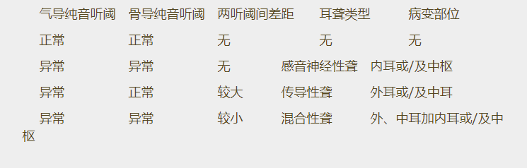 純音聽力檢查結果體現為純音聽力圖。</p><p> 正常情況下我們是通過兩條途徑來感受聲音信號的——氣導途徑和骨導途徑。前者我們非常熟悉,從外耳到中耳到內耳到聽中樞;后者我們或許不太注意:從顱骨直接到內耳到聽中樞。相應地,純音聽力檢查也有兩種聲音剌激方式,氣導輸入和骨導輸入。前者我們天天使用,而后者則很少被我們使用。事實上,兩閾值曲線的異同正是我們判斷聽損病變部位的基礎(見下表)。了解患者病變部位對于獲得他們的信任以及確定助聽器電聲性能都有非同尋常的意義。因此,有條件的時候還是應當重視骨導聽閾測試。</p><p style="text-align: center;"><img src="/upfiles/201906100237368907.png" alt="" /><br /></p><p> 更多詳情請登錄聽覺有道助聽器www.jjrhy.com</p>" />