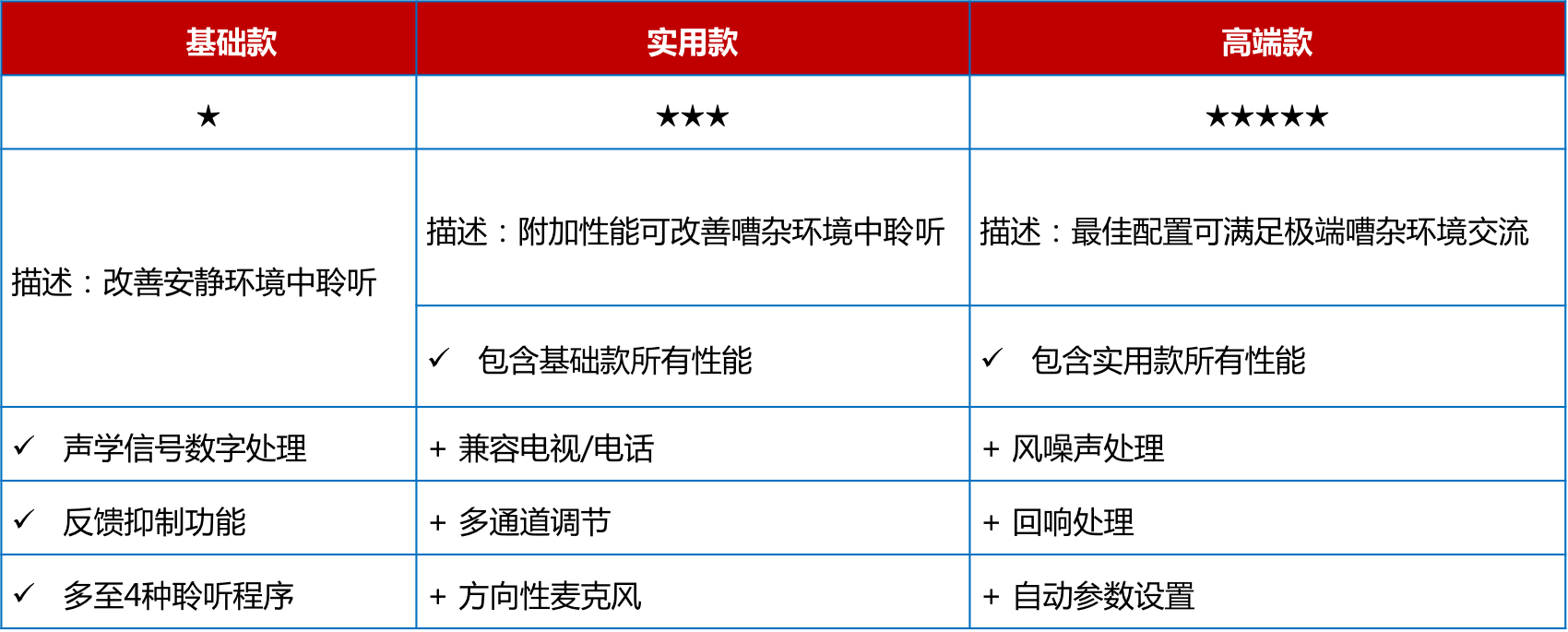 <span style="font-size:16px;"> 助聽器價格取決于機器的檔次,而檔次由內含的技術種類決定。助聽器檔次大致可分為基礎款、實用款、高端款。這三種檔次的區別請參見下表:</span></p><p style="text-align: center;"><span style="font-size:16px;"><img src="/upfiles/201808150226553383.png" width="640" alt="" /><br /></span></p><p><span style="font-size:16px;"> 那么,如何應該選擇哪種檔次的助聽器呢?</span></p><p><span style="font-size:16px;"> 選擇助聽器時主要需要考慮兩大因素。首先要考慮的就是弱聽人士的聽力損失程度,其次要考慮的就是弱聽人士的日常生活方式。比方說,某位弱聽人士是中度聽力損失,日常在家為主,那么實用款檔次助聽器通常可以滿足TA的需求。</span></p><p><span style="font-size:16px;"> 當然,這里只是為助聽器選配提供了大致方向,如何選配仍然需要具體情況具體分析,最好還是需要跟驗配師面對面溝通。</span></p><p><span style="font-size:16px;"> 1、高端款助聽器</span></p><p><span style="font-size:16px;"> 不同廠家的高端款助聽器均代表了各自的尖端技術,并致力于提供最佳的音質。</span></p><p><span style="font-size:16px;"> 這類助聽器高端之處在于自動適應各種聆聽環境,最優化佩戴者的聆聽清晰度和舒適度,讓佩戴者在極度嘈雜的環境中,如咖啡館,也能清晰地聽到同伴的言語聲。常見性能包括:</span></p><p><span style="font-size:16px;"> (1) 多種外觀、顏色可選;</span></p><p><span style="font-size:16px;"> (2) 環境自適應;</span></p><p><span style="font-size:16px;"> (3) 360°信號追蹤;</span></p><p><span style="font-size:16px;"> (4) 兼容各種藍牙設備。</span></p><p><span style="font-size:16px;"> 高端款助聽器為什么能夠自動適應各種聆聽環境呢?這是因為左右兩側的高端款助聽器能夠相互“通電報”,精準判斷所處的聆聽環境并自主學習,給出最佳的助聽設置。</span></p><p><span style="font-size:16px;"> 比如,您經常出入一家書店,每次您進入這家書店時總是習慣性地將音量調低2分貝;長此以往,當您再次進入該書店時,兩臺助聽器將會默契地降低2分貝。</span></p><p><span style="font-size:16px;"> 360°信號追蹤可以幫助佩戴者建立更佳的空間感知,對所處環境有充足的把控和預判,避免一些潛在的危險。而當助聽器連接至各種藍牙設備時,聆聽清晰度會更高,且不會打擾其他人。</span></p><p><span style="font-size:16px;"> 比如家人總是抱怨您把電視機聲音開得太大,拒絕跟您一起觀看電視時,您可以選配能夠兼容電視的助聽器,并進行獨立的音量調節,而家人只需設置為常規音量即可。高端款助聽器的價位一般在15000以上。</span></p><p style="text-align: center;"><span style="font-size:16px;"><img src="/upfiles/201808150228328500.jpg" alt="" /><br /></span></p><p><span style="font-size:16px;"> 2、實用款助聽器</span></p><p><span style="font-size:16px;"> 實用款助聽器的價格一般在8000~15000之間。實用款助聽器包含一定的降噪技術和言語提升功能,可以滿足大多數環境中的聆聽需求。部分廠家的實用款助聽器也可兼容各種藍牙設備。實用款助聽器的突出性能大致包括:</span></p><p><span style="font-size:16px;"> (1) 可連接外接音源;</span></p><p><span style="font-size:16px;"> (2) 言語清晰度提升;</span></p><p><span style="font-size:16px;"> (3) 方向性功能。</span></p><p><span style="font-size:16px;"> 3、基礎款助聽器</span></p><p><span style="font-size:16px;"> 基礎款助聽器的價位一般在8000以下。基礎款助聽器能夠滿足安靜環境中的交流需求,并具備反饋管理功能。反饋管理功能能夠有效提升佩戴舒適度,避免在日常佩戴過程中出現尖銳的干擾聲。</span></p><p><span style="font-size:16px;"> 基礎款助聽器適用于經常在家的弱聽人士,若是生活方式比較豐富多彩的弱聽人士建議選配其他檔次的助聽器。實用款助聽器的突出性能大致包括:</span></p><p><span style="font-size:16px;"> (1) 數字信號處理技術;</span></p><p><span style="font-size:16px;"> (2) 反饋管理功能;</span></p><p><span style="font-size:16px;"> (3) 多種聆聽程序可選。</span></p><p><span style="font-size:16px;"> 更多詳情請登錄www.jjrhy.com。</span></p>" />