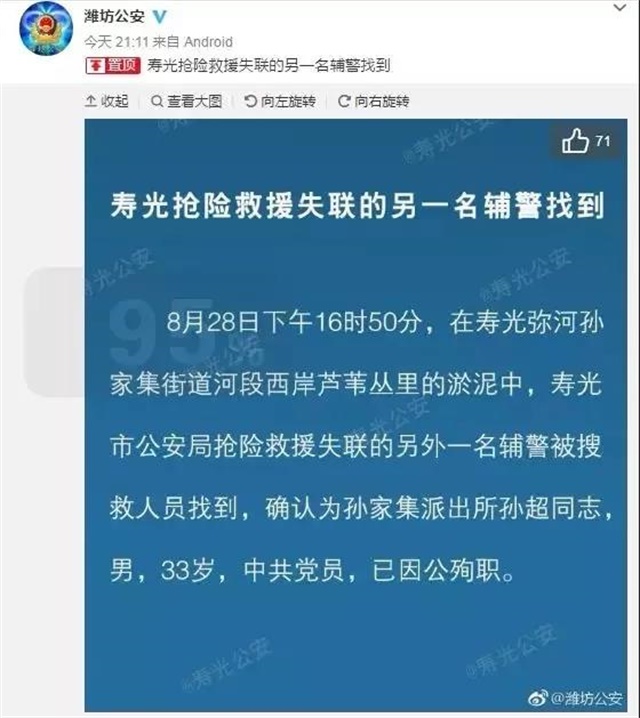 8月28日下午16時,在彌河孫家集街道河段西岸發現另一名輔警,確認為孫家集派出所孫超同志(男,33歲,因公殉職)。