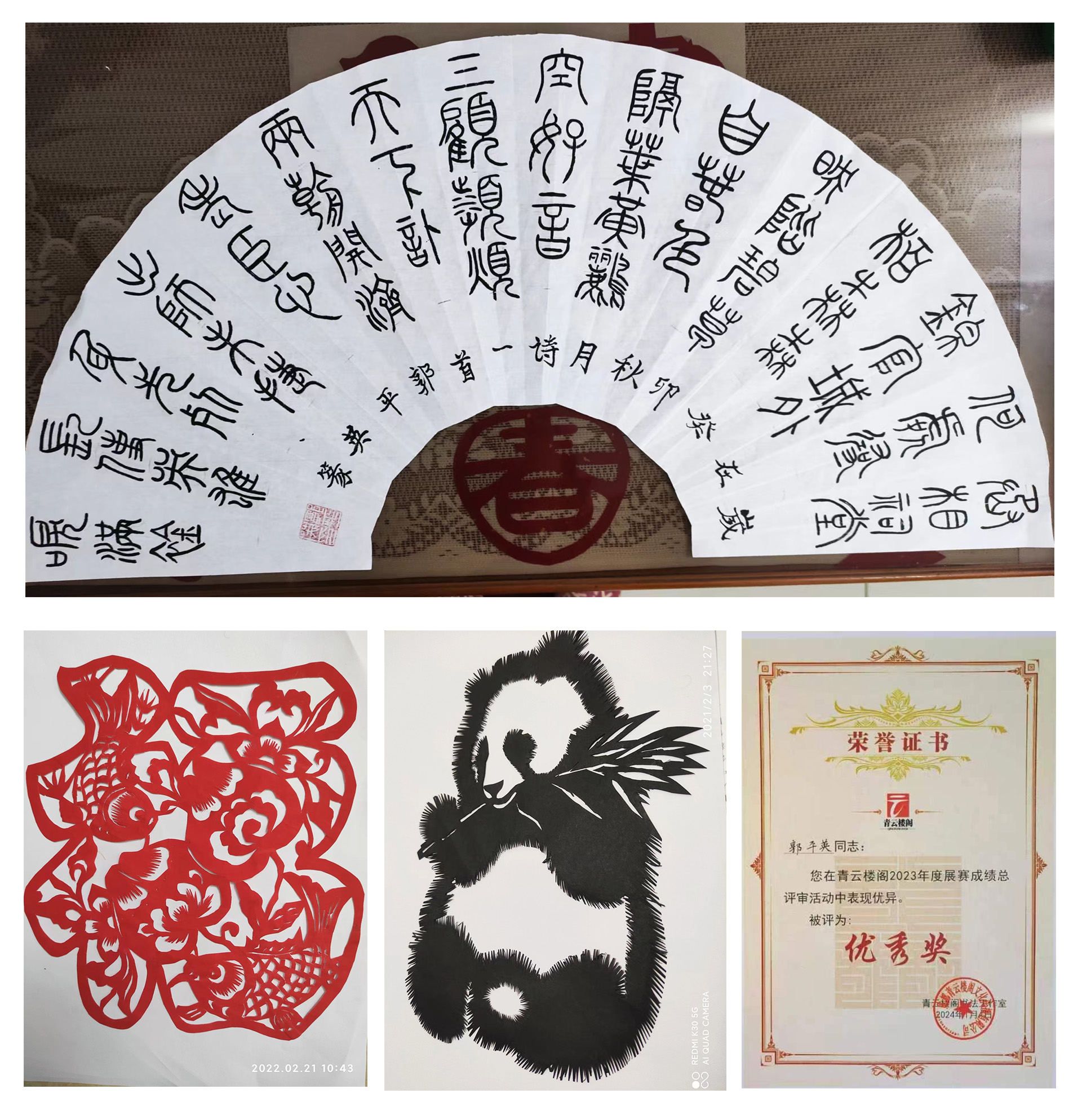 郭阿姨每天都要學習毛筆字、國畫、手工編制、窗花雕刻、彈奏鋼琴等。